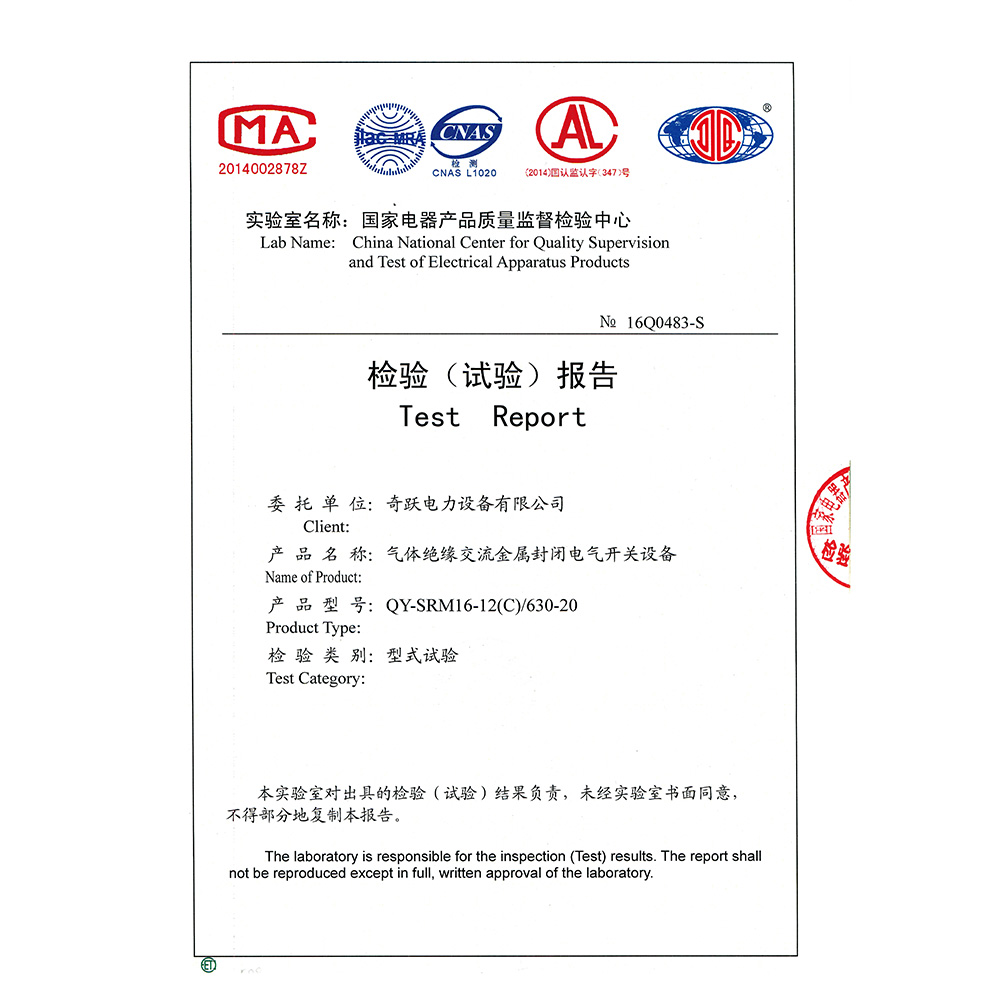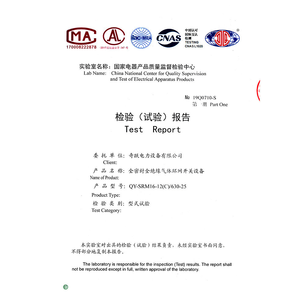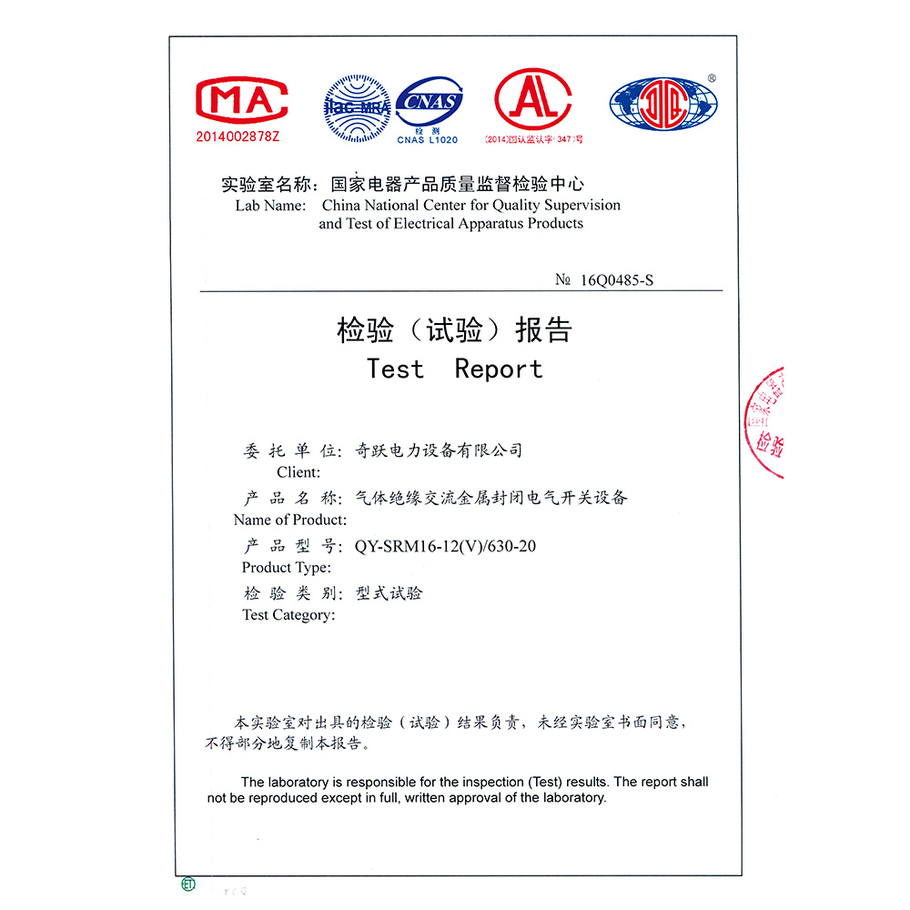 QY-SRM16-12(V)/630-20气体绝缘交流金属封闭电气开关设备 检验报告